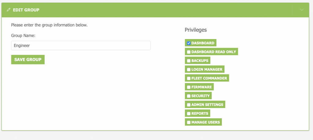 Click the Edit button to change the name or permissions for a group. Select the permissions and click the save group button.